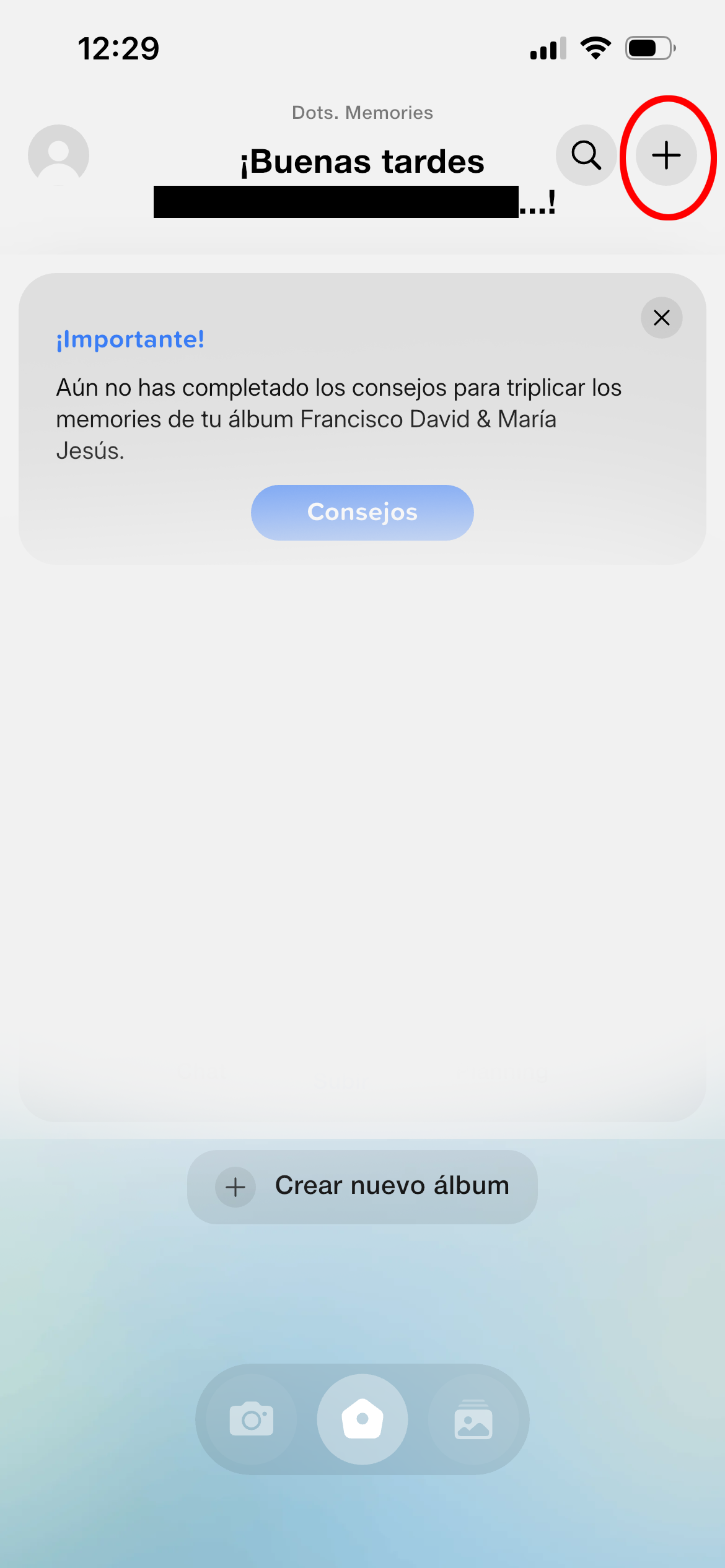 2. Abre la aplicación Dots Memories en tu móvil y haz clic en el icono “+” situado en la esquina superior derecha.